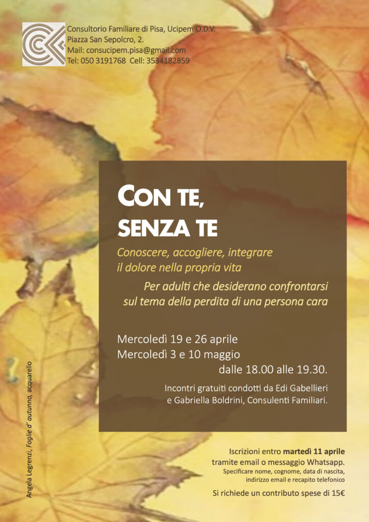 È il cammino che propone il Consultorio familiare Ucipem di Pisa, nei mesi di aprile-maggio, sul significativo tema del lutto, indirizzato a adulti che vogliono riflettere, condividere e confrontarsi in gruppo sulla perdita di una persona cara.